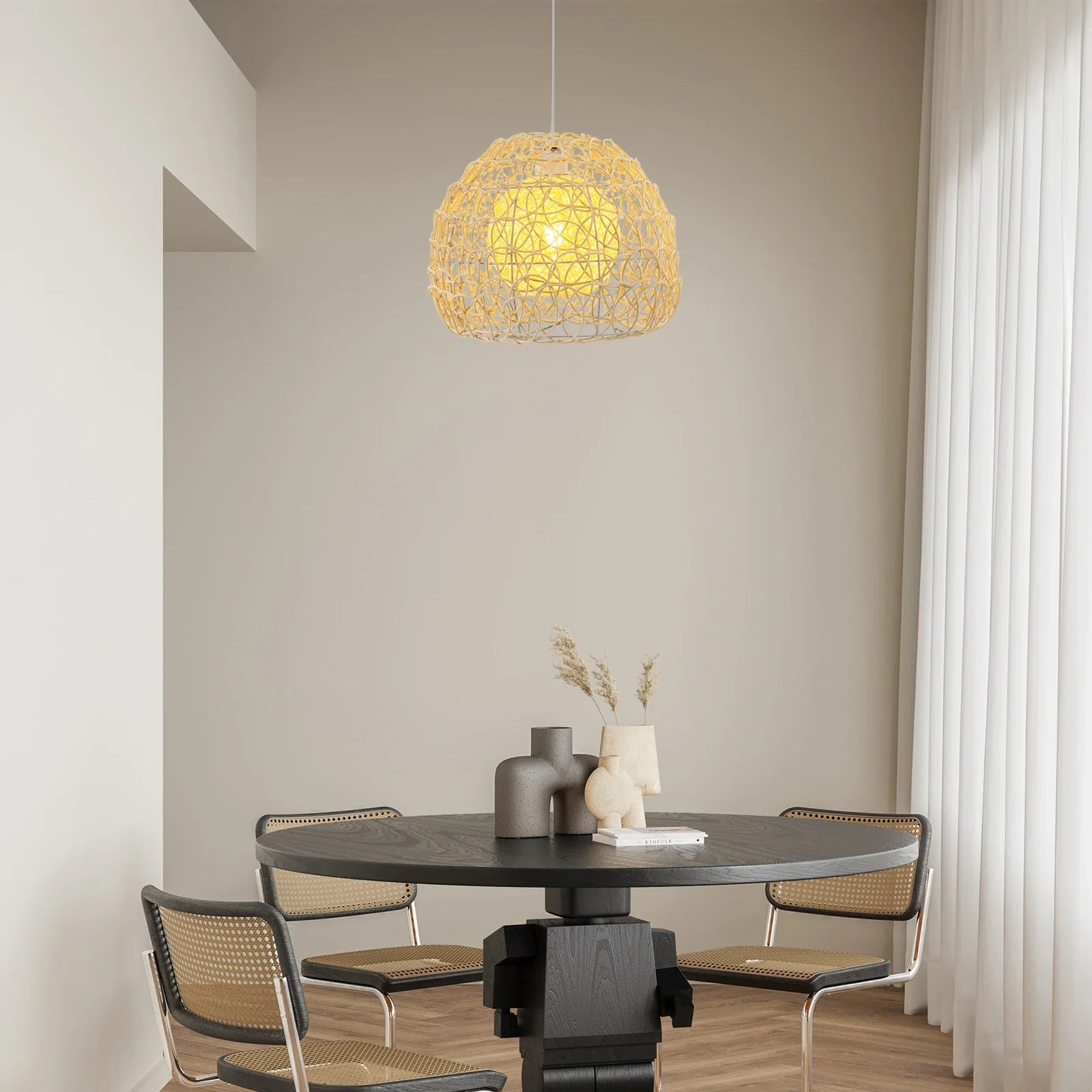The shade is carefully handwoven from natural rattan, creating an airy, sculptural form that lets light filter through in a soft, ambient glow. When illuminated, it casts gentle patterns and adds instant atmosphere, perfect for dining areas, living rooms, bedrooms, or reading nooks.