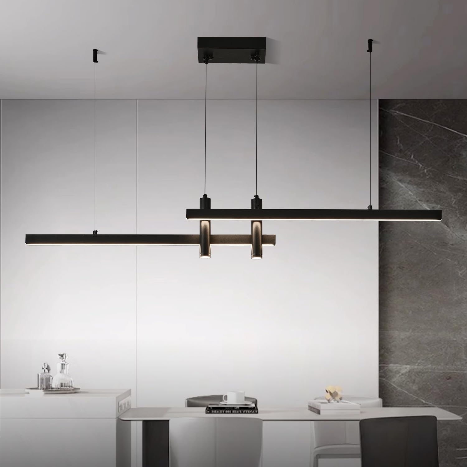This Minimalism stylish and elegant linear chandeliers for dining room goes well with casual spaces, homes or any commercial area. Dining room, kitchen island, cafe, Pool Table, corridors, restaurant, Farmhouse, hotel room and more!